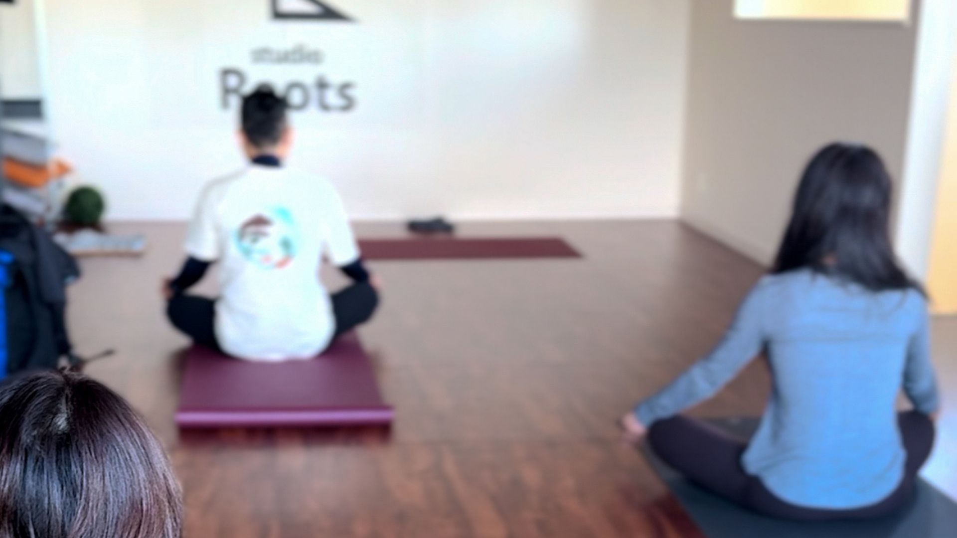 2階のスタジオスペースでヨガマットを敷く